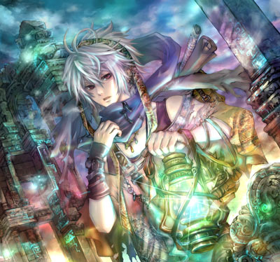 透明度100%の発光レイヤーを新規作成し、物体のフチや、金具、装飾品などに薄い水色でハイライトをいれていきます。ツールは筆です。背景の遺跡的な建物にも、謎の模様を入れてみました。