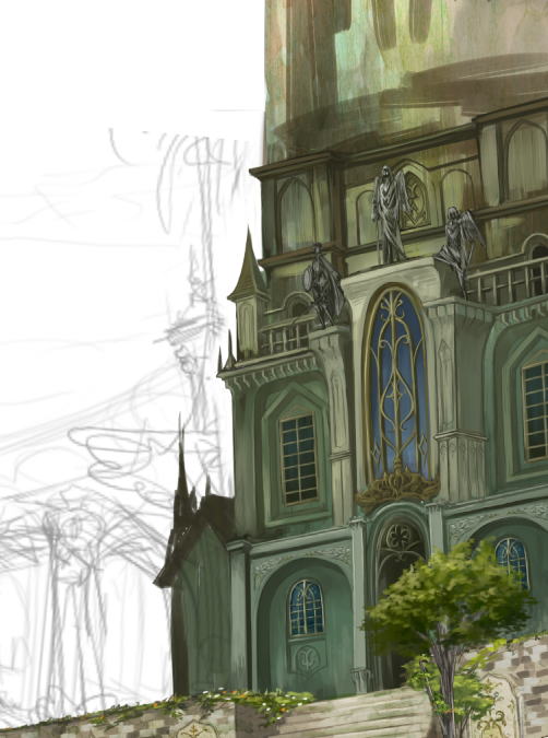 いきなりですが、ここで 横の構図から縦の構図へと変更します。 右端の建物は長い建物のイメージなので 上まで見えたほうが迫力があるかも…。