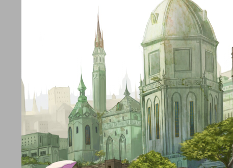 空いた空間は全部空にしようかと思ったのですが ちょっと空きすぎてしまったので、さらに最最遠景を描きます。 ぼやけた感じにしたいので、できるだけ薄い色を選んで 塗りだけで立体を描いて建物っぽい形を描いていきます。