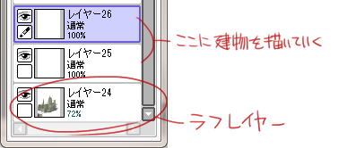 レイヤーを一番下に作り ラフで描いた線が気に入らなかったので 新たに色の濃淡だけで建物のラフを描きます。 1色でシルエットだけ描く場合もあります。