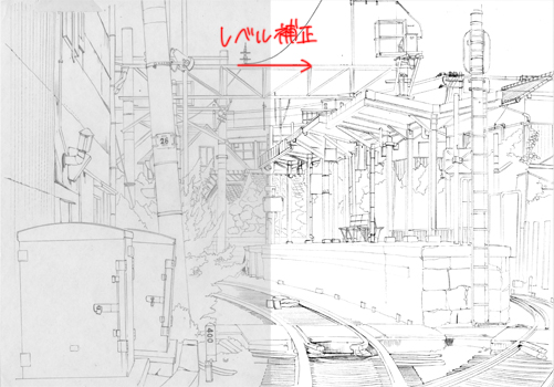 下書きのページで説明したのと同じ方法でスキャンして取り込み、レベル補正してゴミを飛ばします。